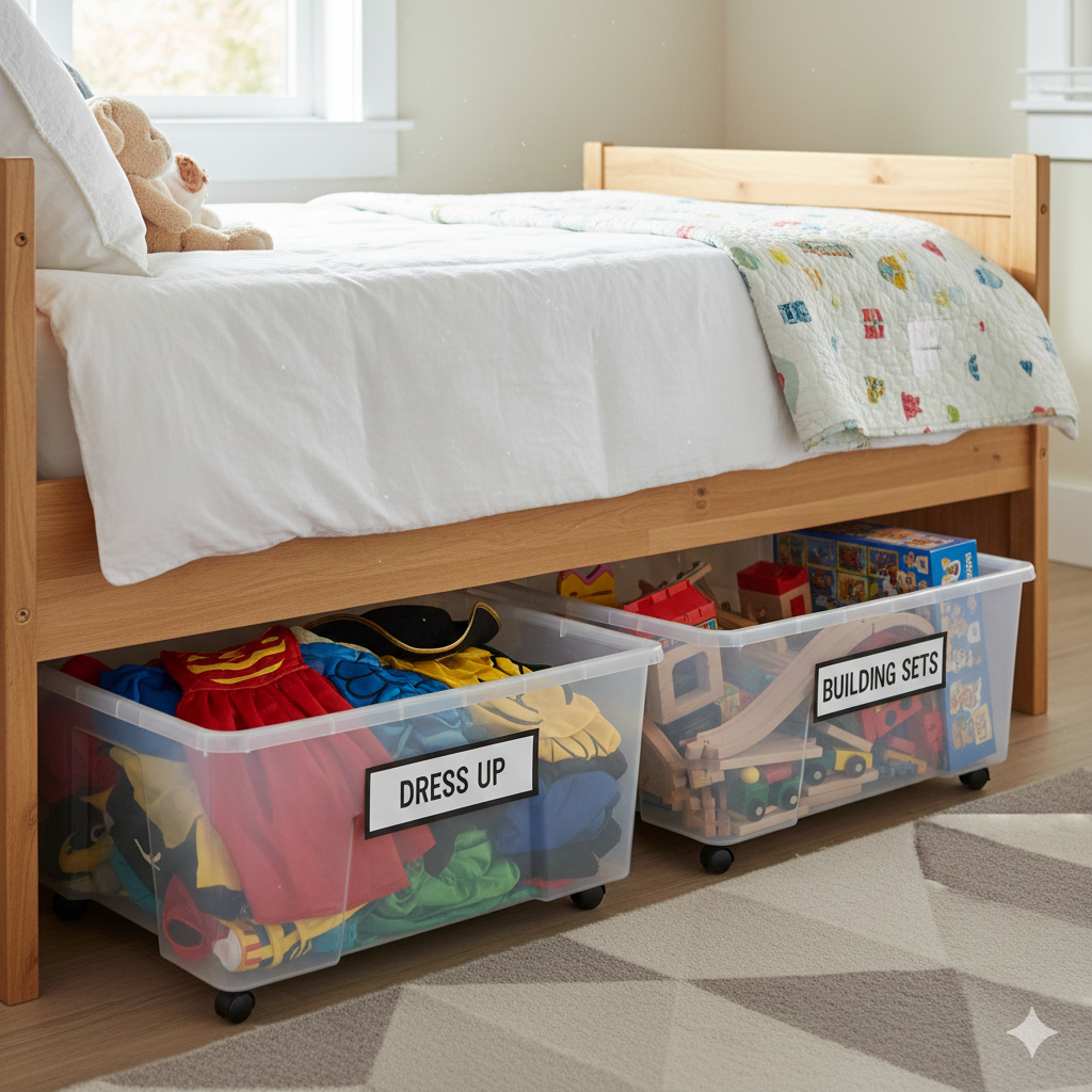 The best use of under-bed storage is for toys that are not needed daily. Daily favourites should stay accessible in open bins or shelves. Under-bed storage works best for weekly-use items, seasonal toys, or “big sets” that are fun but not constant.