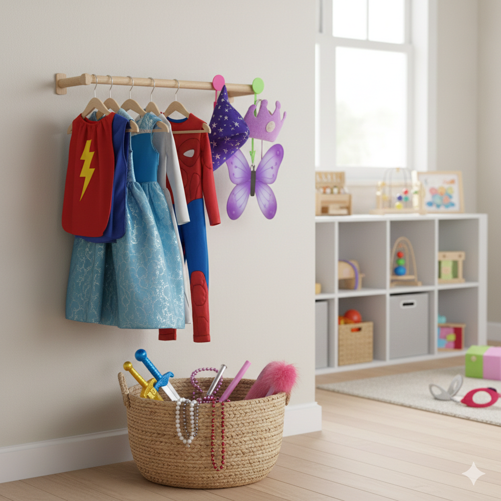 A small setup is enough: three to six hooks at child height, plus a basket underneath for accessories like crowns, masks, and wands. This keeps the whole dress-up category together and prevents it from spreading into unrelated bins.
