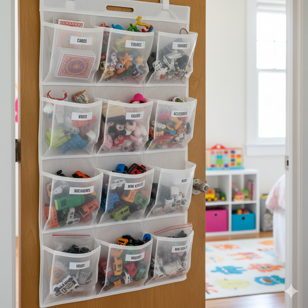 Small toys are often the biggest clutter problem: figurines, doll accessories, card games, small vehicles, and random pieces. Hanging door organisers provide pockets for each category, keeping everything visible, separated, and easy to return.