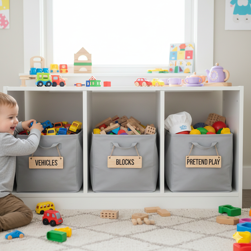 To keep this simple and effective, broad categories work best. A bin labeled “Vehicles” prevents endless sorting by type. “Blocks” keeps all building items together. “Pretend Play” covers kitchen toys, play food, and costumes. The goal is speed, not a museum-level catalog. When categories are simple, children can participate without feeling overwhelmed, and the home stays easier to reset.