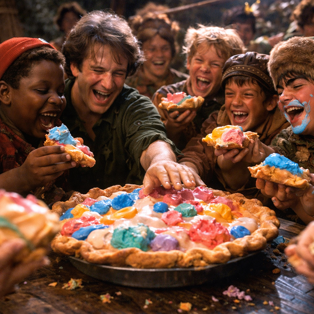 In the world of Hook, Peter Pan and the Lost Boys share an unforgettable moment of whimsy when they “eat” an imaginary pie in one of the film’s most famous scenes. The pie doesn’t actually exist, but through the power of imagination, it becomes as real as any other dessert. The Lost Boys devour it with gusto, laughing and playing as they use their minds to create a delicious treat.