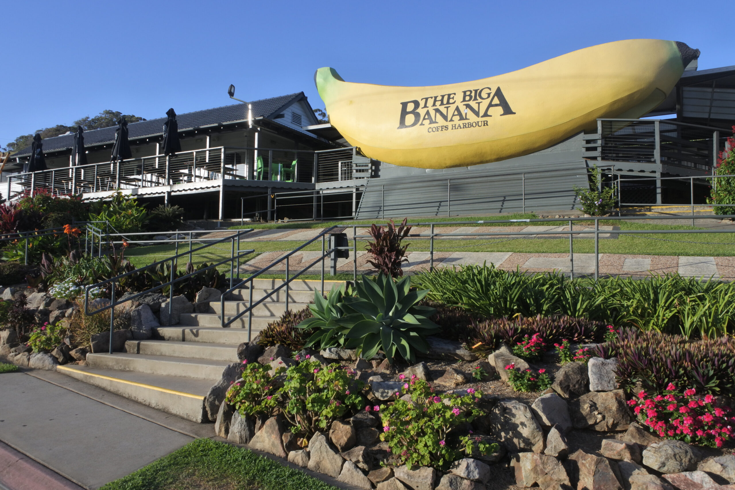 A massive, bright yellow banana marks the entrance to the Big Banana in Coffs Harbour, Australia. This building is both a tribute to the region’s banana industry and a popular tourist attraction.