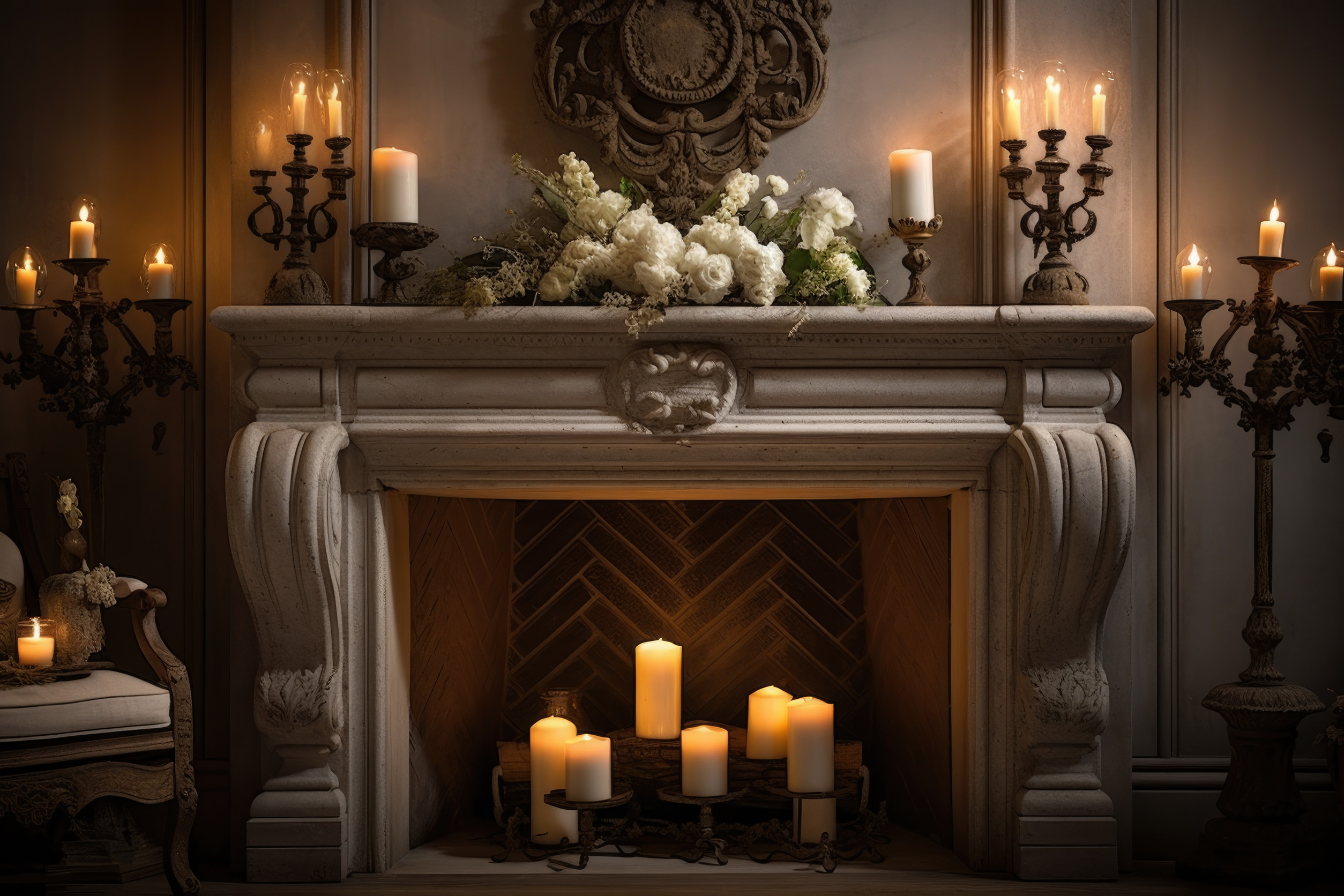 fireplace mantel adorned with candles