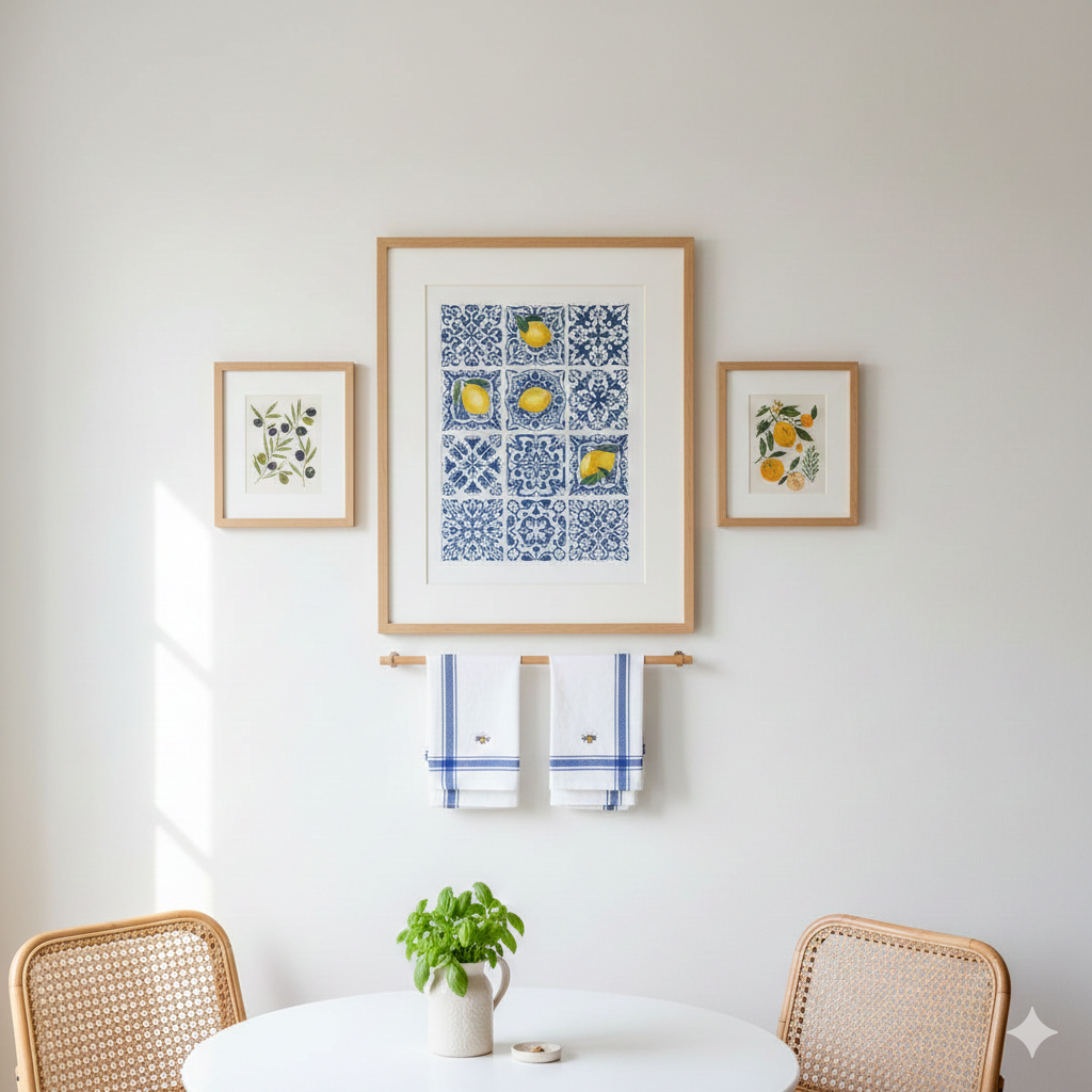 • Float-mounted tea towels: Decorative tea towels become instant art, especially those with botanical motifs, lemons, herbs, or simple stripes. Float mounting allows edges or hems to show, adding charm while still looking intentional.
