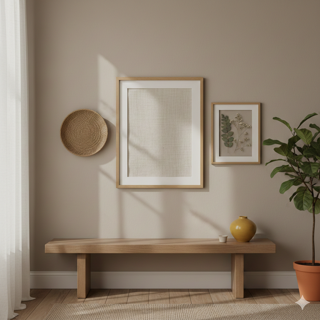 Use fewer pieces with larger scale, repeat frame finishes, keep spacing consistent, and rely on texture (linen, baskets, wood grain) instead of loud color.
