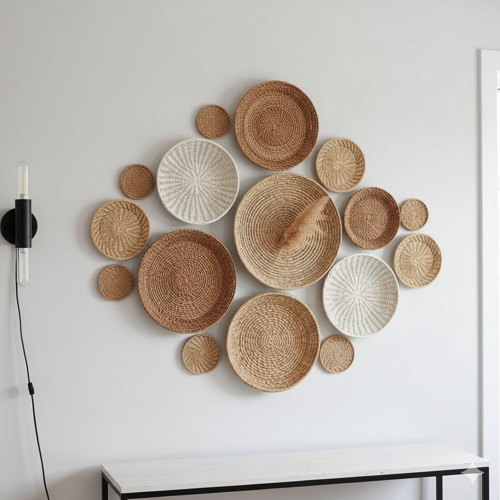 To keep basket wall art modern rather than dated, a single contrasting element nearby helps: a minimalist framed print, a simple sconce, or a clean-lined console. This contrast freshens the look and makes the baskets feel intentional in contemporary spaces.
