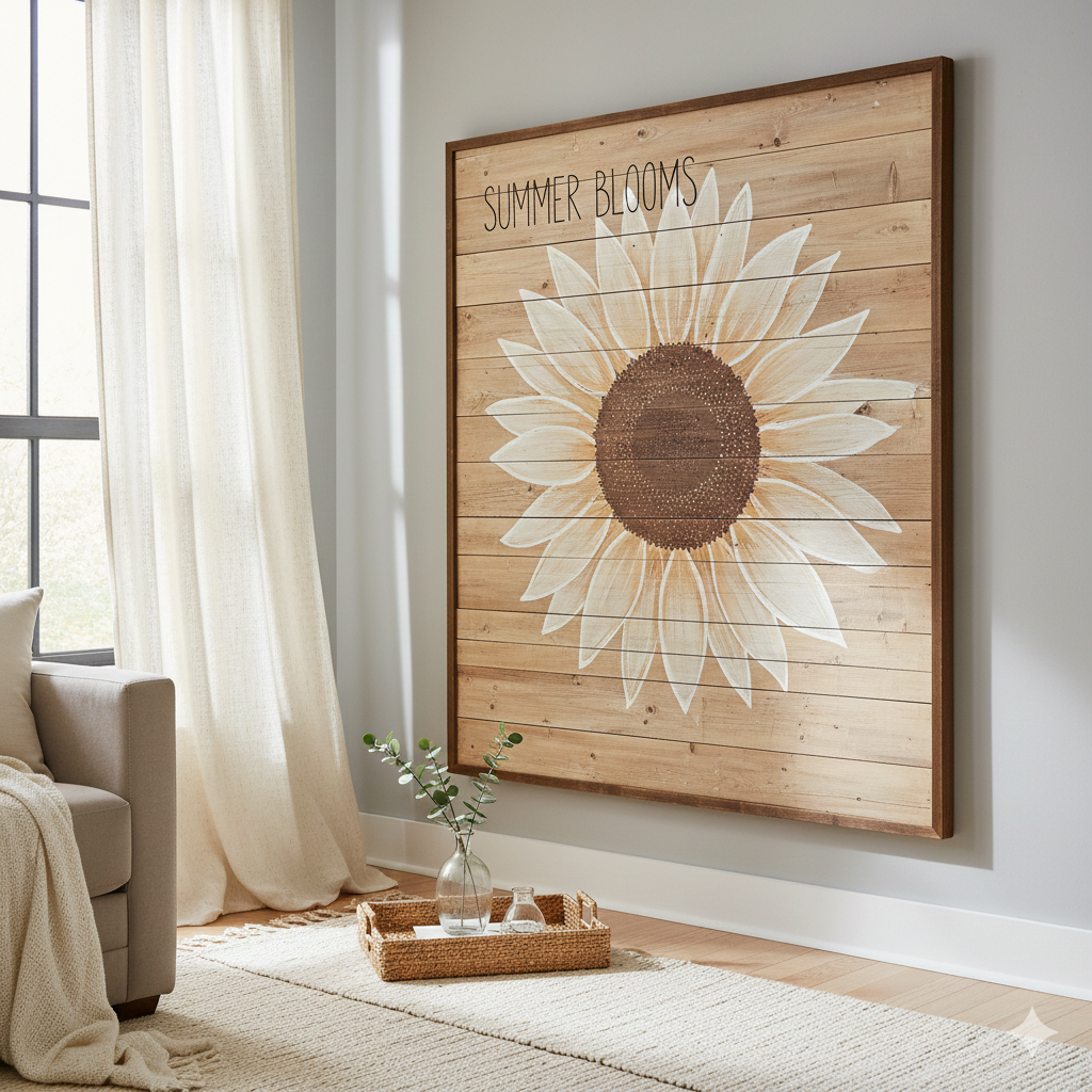 A sunflower motif is a classic for summer because it reads clearly from across a room and pairs naturally with rustic wood. A polished approach keeps the design bold but not busy: