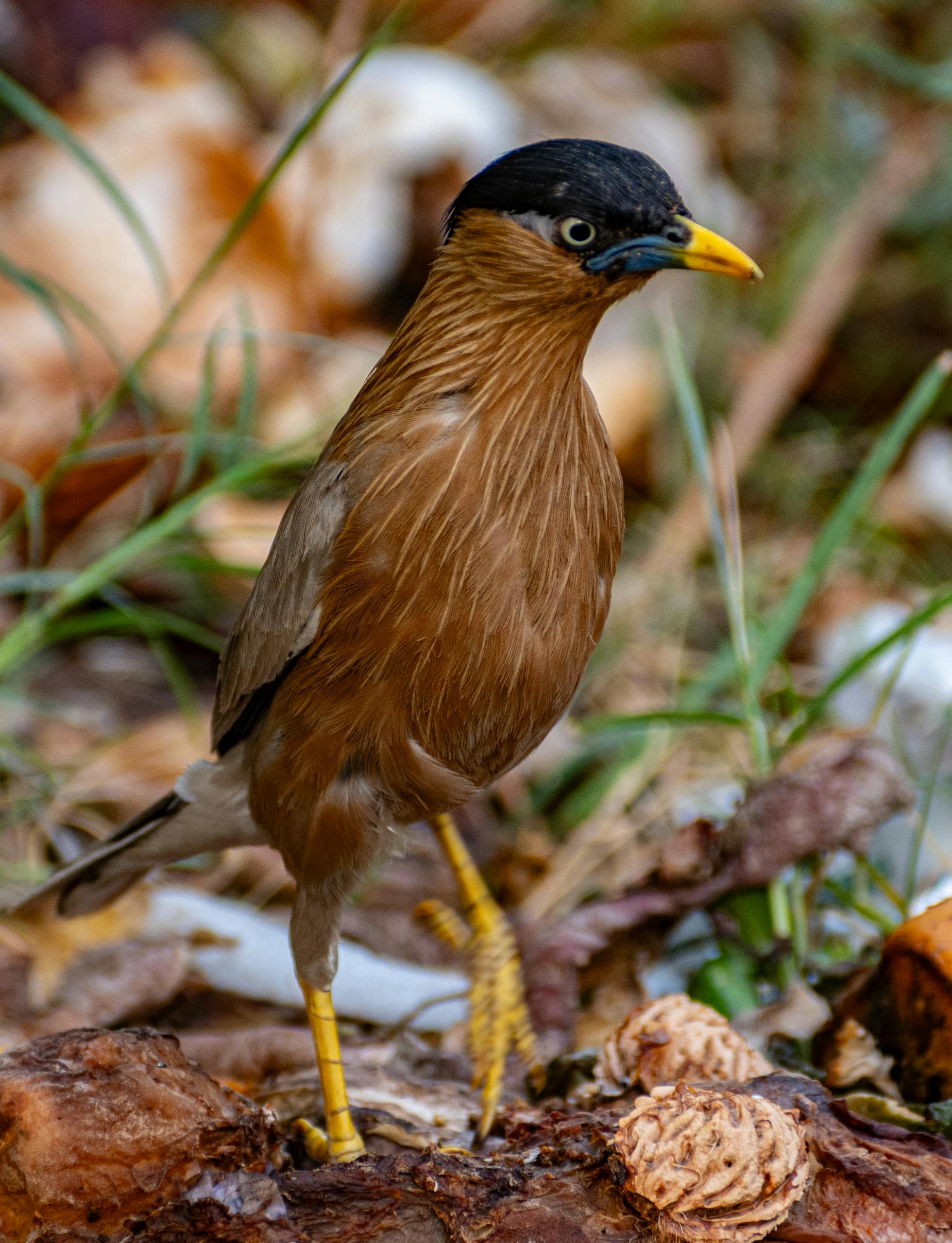 Close-up of a Brahminy Starling displaying vibrant feathers in its natural surroundings.