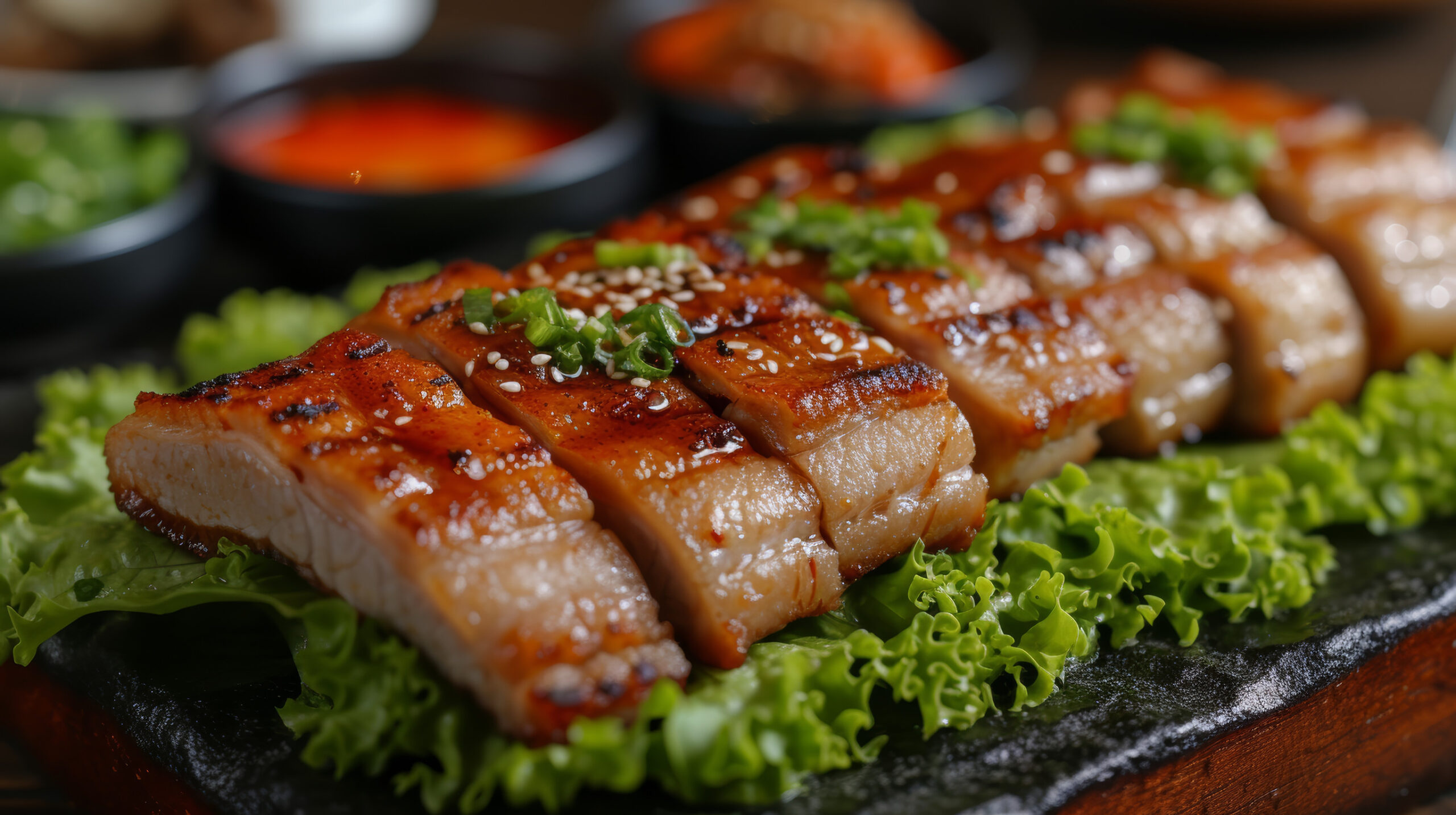 Samgyeopsal, or grilled pork belly, is one of the most popular Korean BBQ dishes, and it’s no surprise why. Thick slices of pork belly are grilled right at the table, and diners can enjoy them by dipping them in a variety of sauces or wrapping them in lettuce with garlic, sesame oil, and a bit of ssamjang (a thick, savory paste).