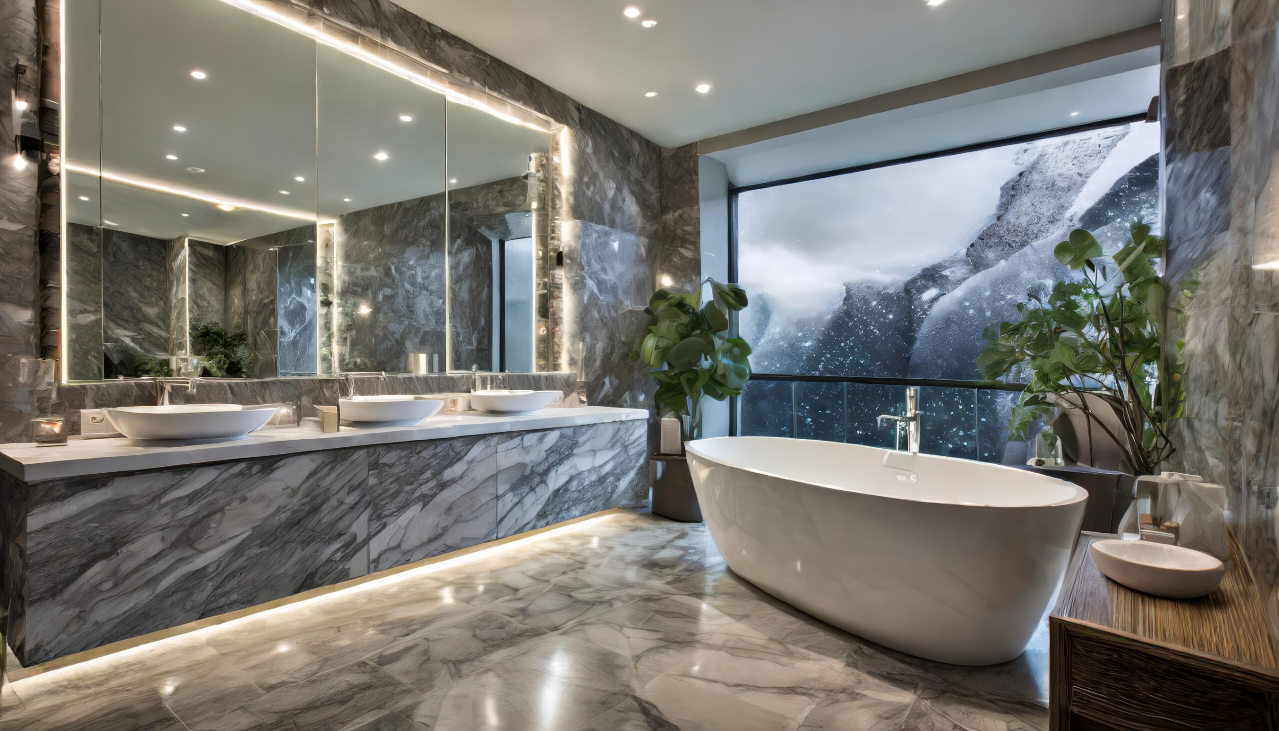Pair this with dimmable sconces or backlit mirrors to create a soft, flattering glow that complements your bathroom’s luxurious elements. For extra drama, consider LED lighting that changes color to enhance the space’s ambiance.