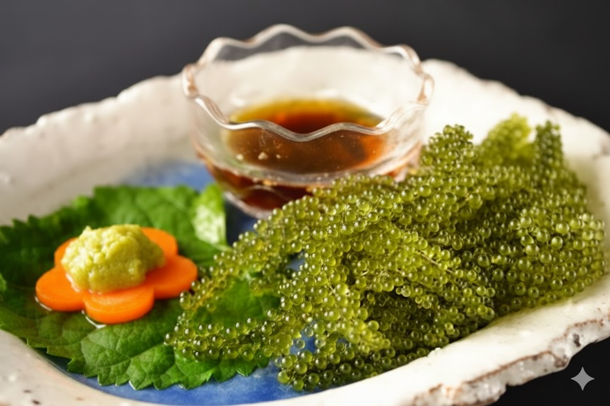 Known as umi budou, green caviar is not actually caviar at all. Instead, it is a type of seaweed that grows in the shallow waters of Okinawa. These little green pearls, also known as sea grapes, have a distinct texture and flavor. When eaten, they burst in your mouth, releasing a salty, slightly tangy flavor.