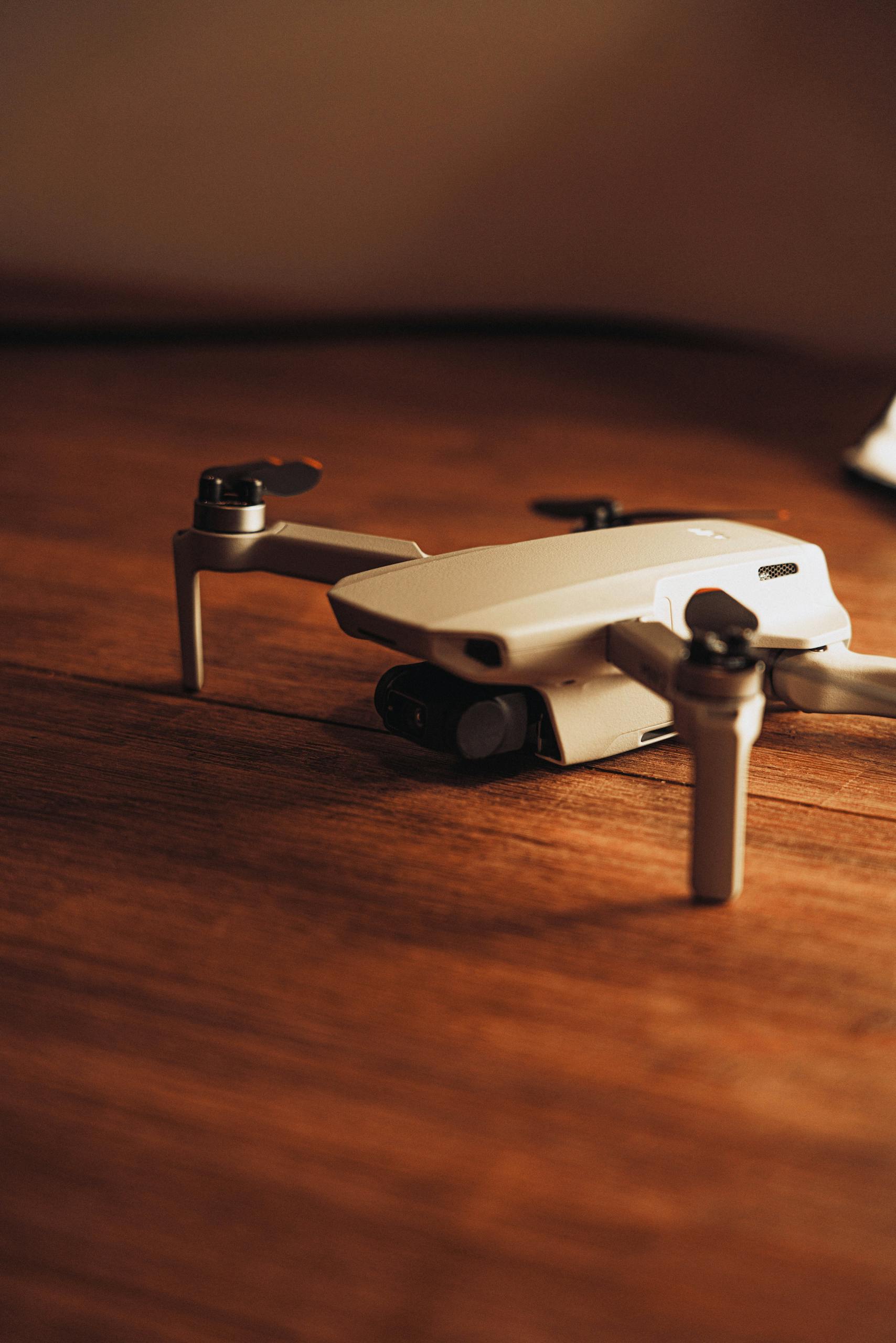 Detailed view of a DJI Mavic Mini 2 drone resting on a wooden surface, showcasing modern technology.