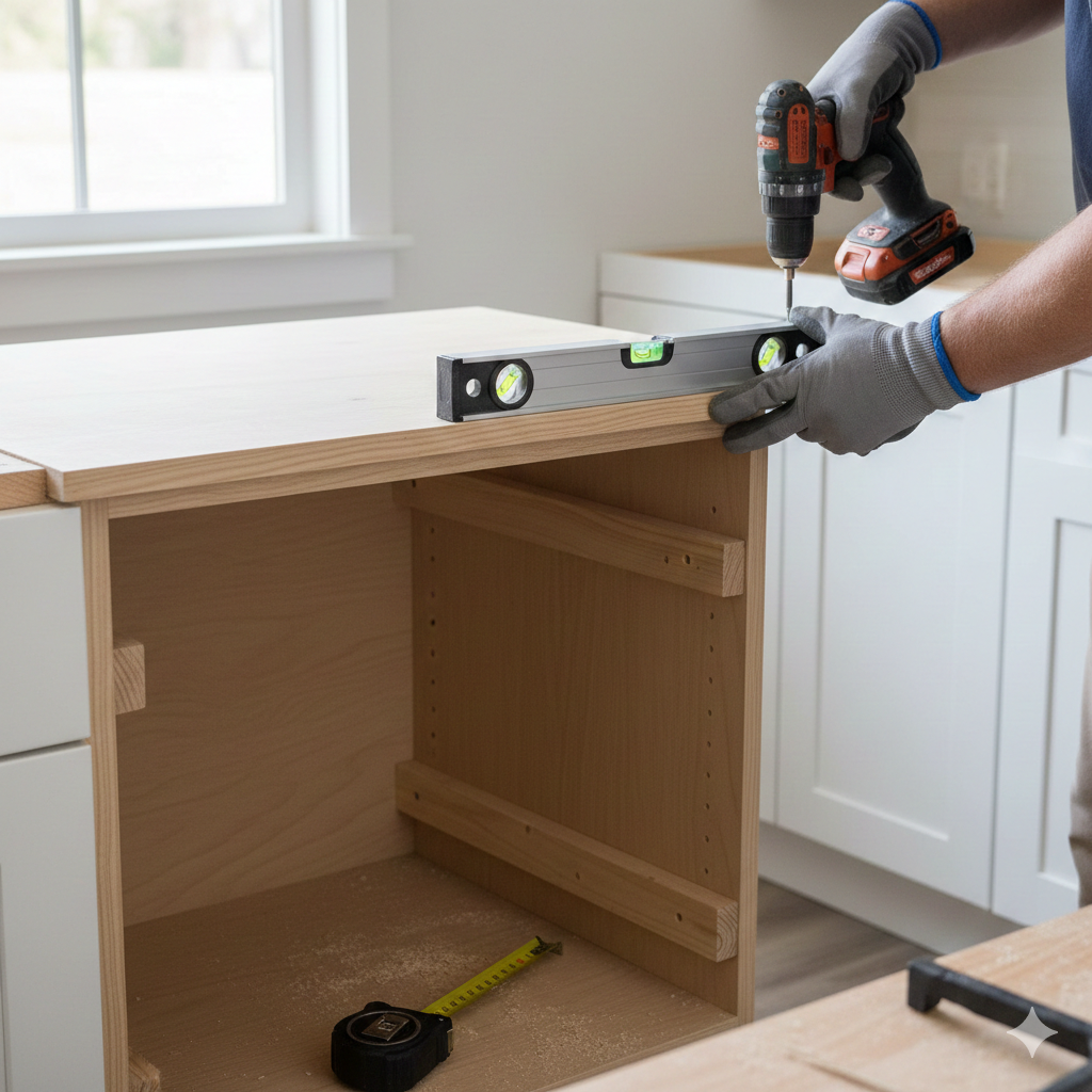 With the shelf top cut to size, place it on the installed cleats. Ensure it’s level before securing it in place with finish nails or screws. Double-check for any gaps between the shelf and the cabinets, and adjust if necessary.
