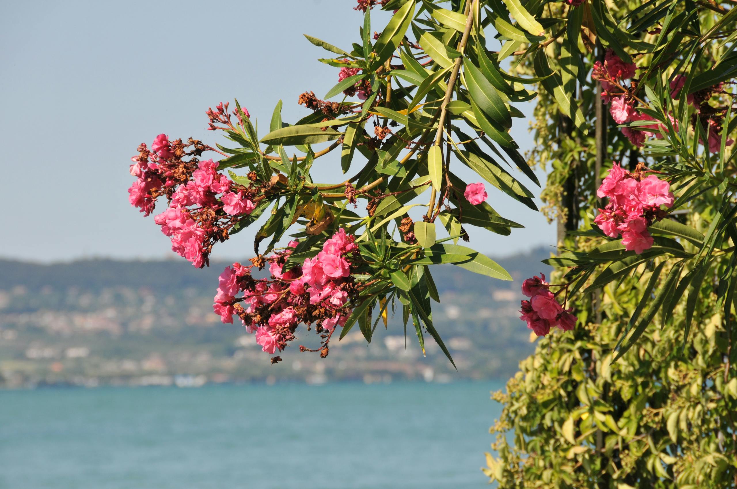 Vibrant pink oleanders overlooking the serene waters of Lake Garda in Sirmione, Italy.