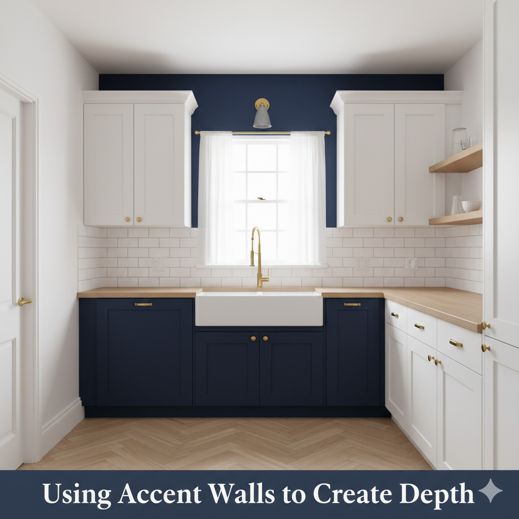 An accent wall can help create depth, making your small kitchen appear bigger by drawing attention to a single feature. Choose a bold color, such as deep navy or charcoal, for the accent wall, while keeping the rest of the kitchen light. This draws the eye upwards, giving the impression of a more expansive area.