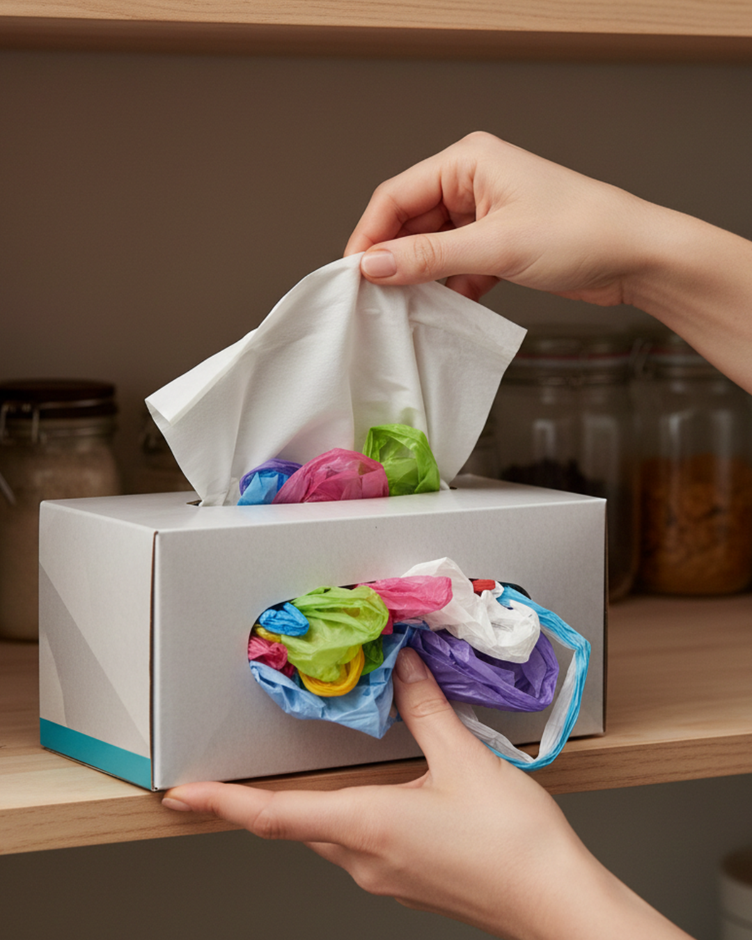 One of the easiest and most space-efficient ways to store plastic bags is by repurposing anempty tissue box. This method requires minimal effort and is highly effective for smaller collections of bags.