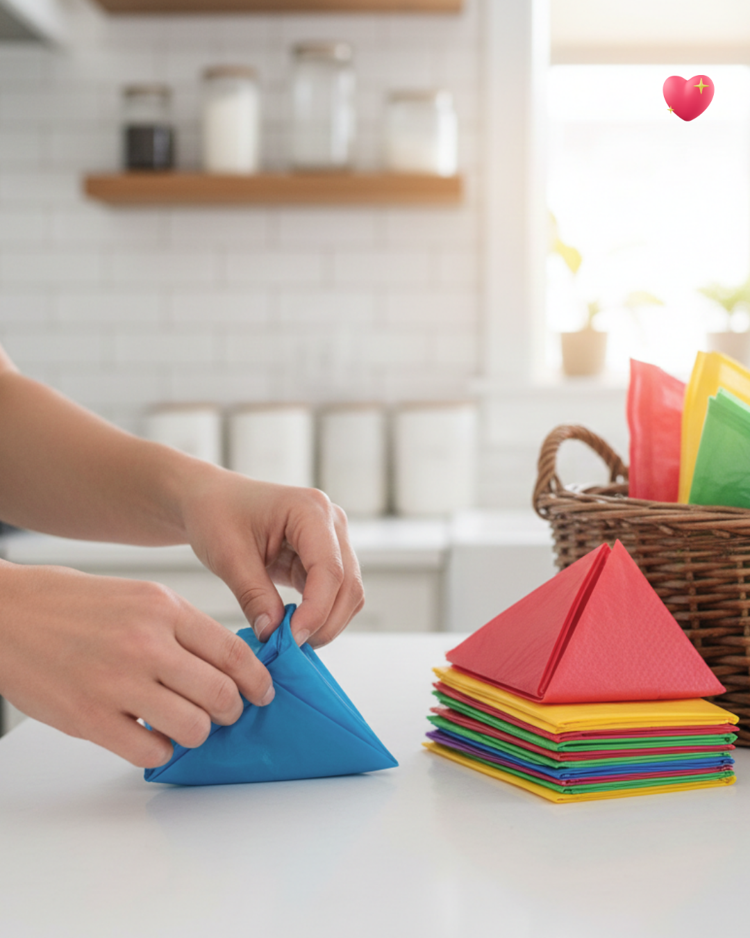 Continue folding it into smaller sections until you’re left with a small, neatly stacked triangle. The result is a perfectly organized pile of bags that can be easily stored in a basket, bin, or drawer.