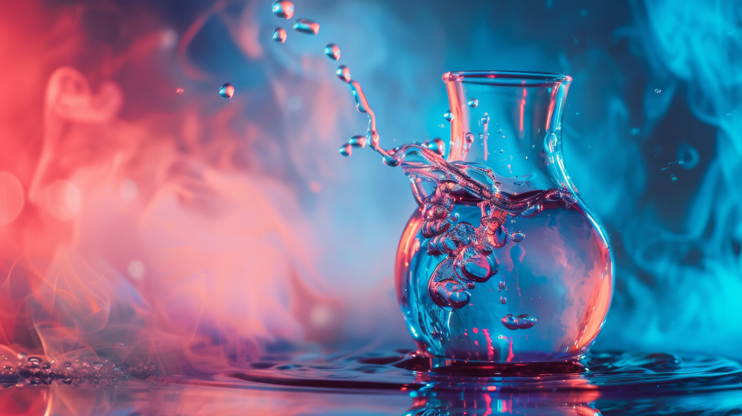 A dynamic and artistic capture of a water splash in a transparent vase, with vibrant colors and smoke creating a surreal effect.
