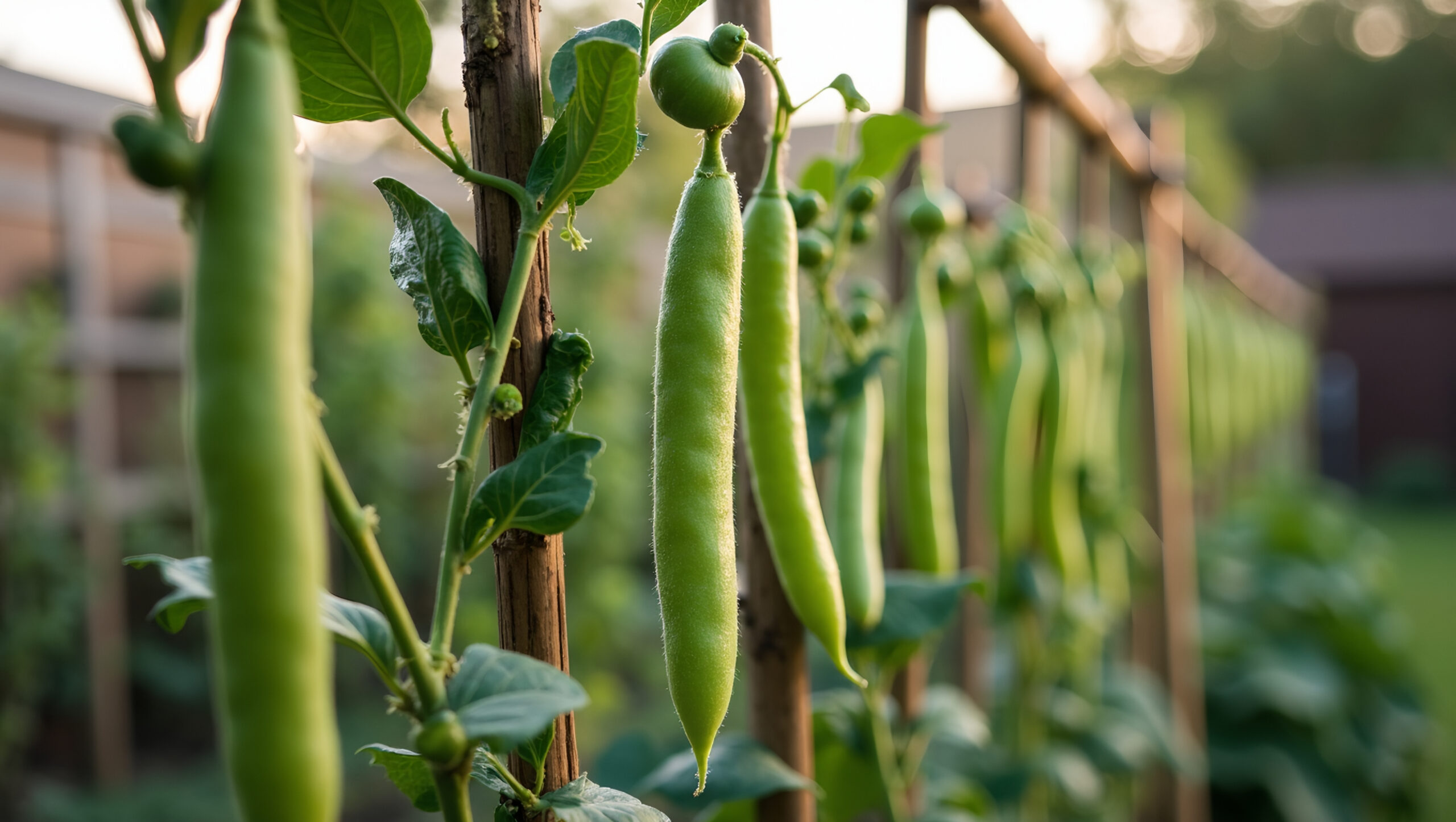 Vibrant green peas on trellis in backyard garden bathed in soft afternoon light