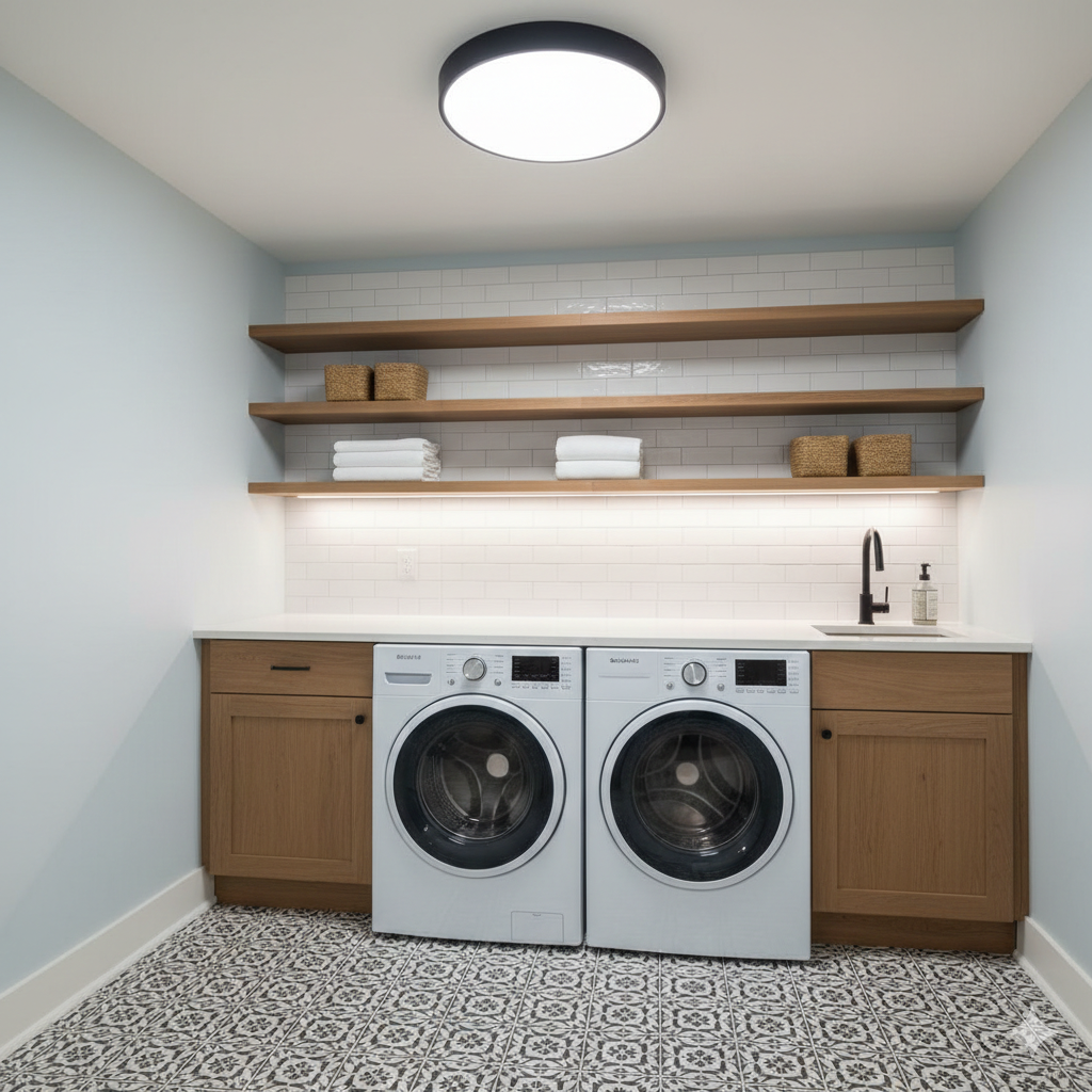 Proper lighting in a laundry room can enhance both function and mood. Install bright overhead lights for visibility, but also consider adding task lighting under shelves or above your folding counter to ensure well-lit workspaces. Consider LED lighting for energy efficiency and a sleek, modern appearance.
