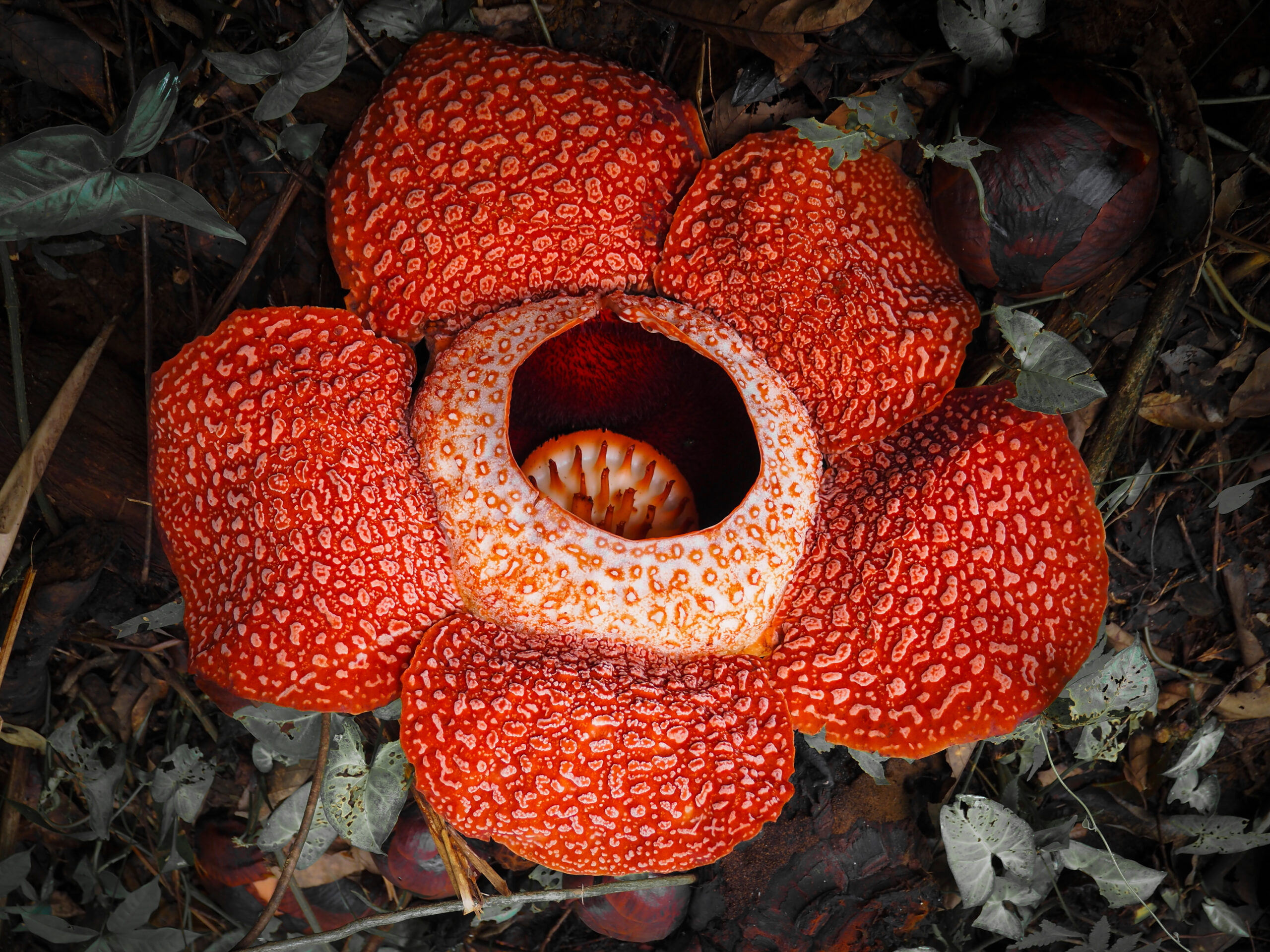 Rafflesia arnoldii, the corpse flower’s close relative, is known for producing the largest single flower in the world, which can grow up to three feet in diameter.
