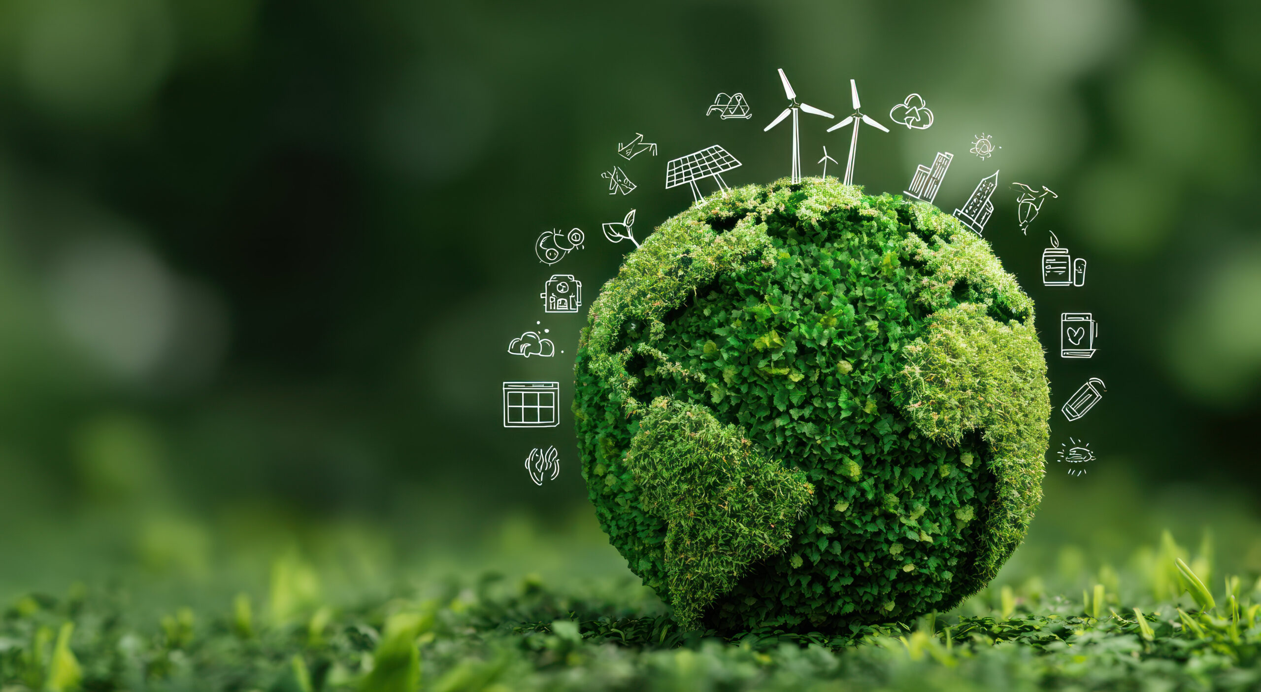 A green textured globe is the central subject of this image, adorned with illustrations representing sustainable energy sources. It is set against a blurred background of green vegetation, suggesting an outdoor environment. The composition conveys environmental consciousness, potentially suitable for eco-friendly or sustainability-themed publications.